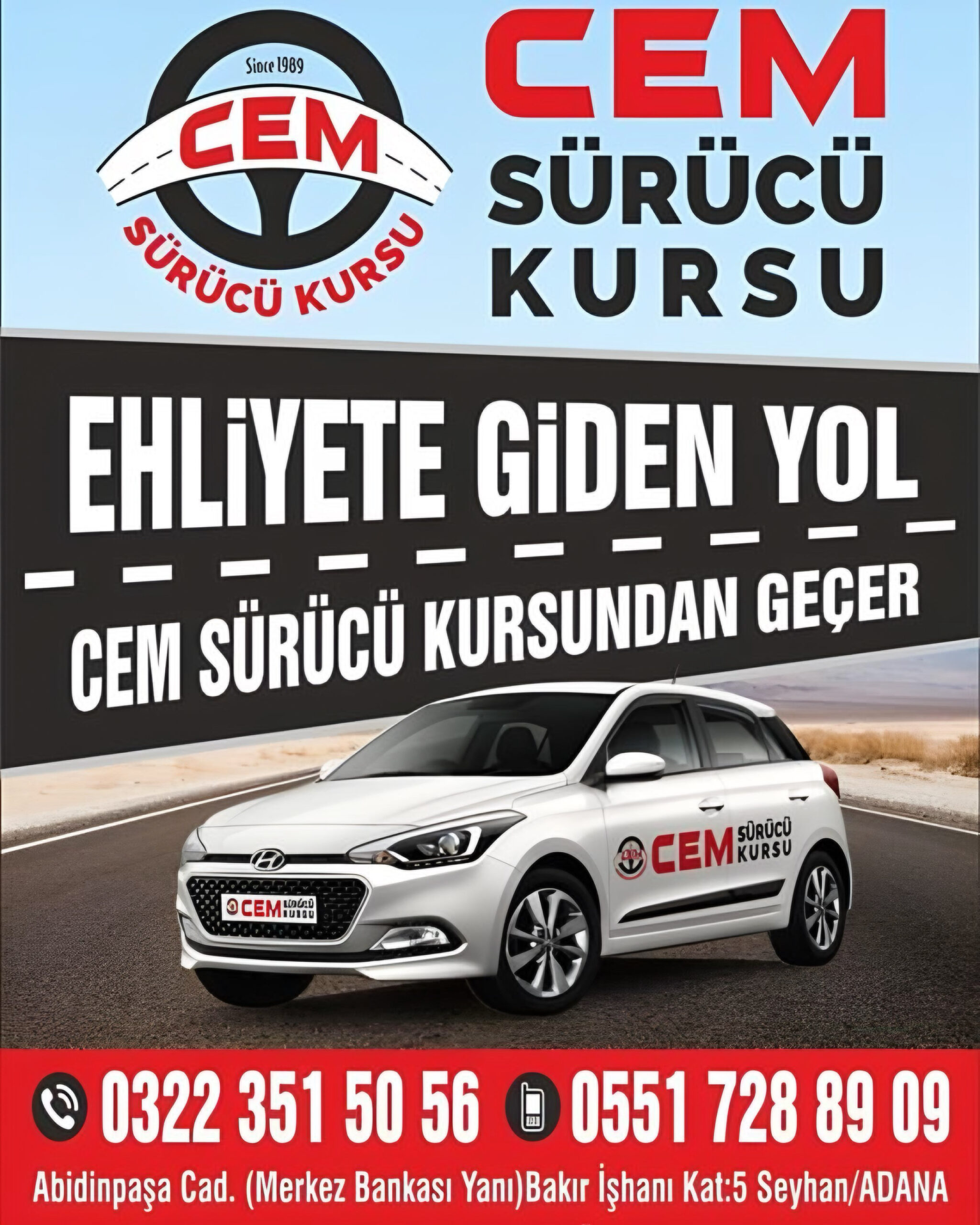 Adana’da Abidin paşa caddesinde 35 yılı aşkın süredir faaliyet gösteren Cem Sürücü Kursu, yılların trafik deneyimi ve birikimini özveriyle sürücü adayları ile paylaşarak, trafik kazalarının en aza düşürme yolunda ilerliyor. Ülkedeki trafik kazalarının büyük bölümünün eğitimsizlikten kaynaklandığına inanan Adana Cem Sürücü Kursu, amacına uygun eğitimin verilmesi dahilinde trafik kazalarının en aza indirebileceğini ve ölümlerin de minimum seviyelere düşürülebileceğine inanarak çalışıyor.