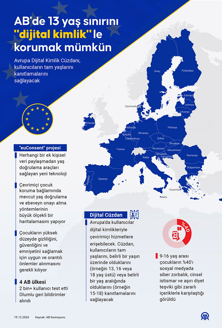 Avrupa Birliği’nde (AB) sosyal medya kullanımında yaş sınırı 13 ile 16 arası olarak belirlenirken üzerinde çalışılmaya devam edilen birçok projenin yanı sıra Avrupa Dijital Kimlik Cüzdanı sayesinde kullanıcıların yaşlarının kanıtlanması hedefleniyor.